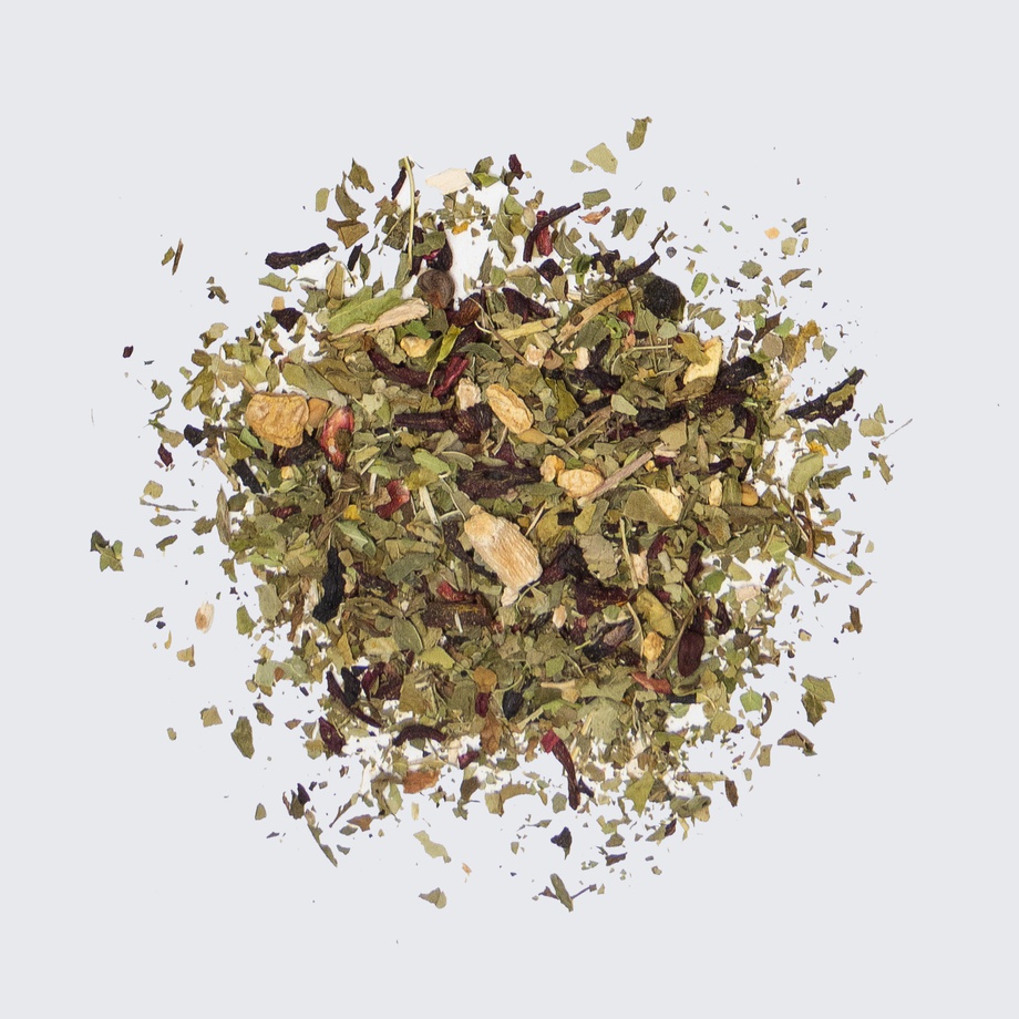 Spearmint, moringa, yerba mate, damiana, cinnamon, gotu kola, ashwagandha, lavender, hibiscus, juniper berries, ginger, slippery elm, tomato flakes, turmeric, black pepper, fenugreek.